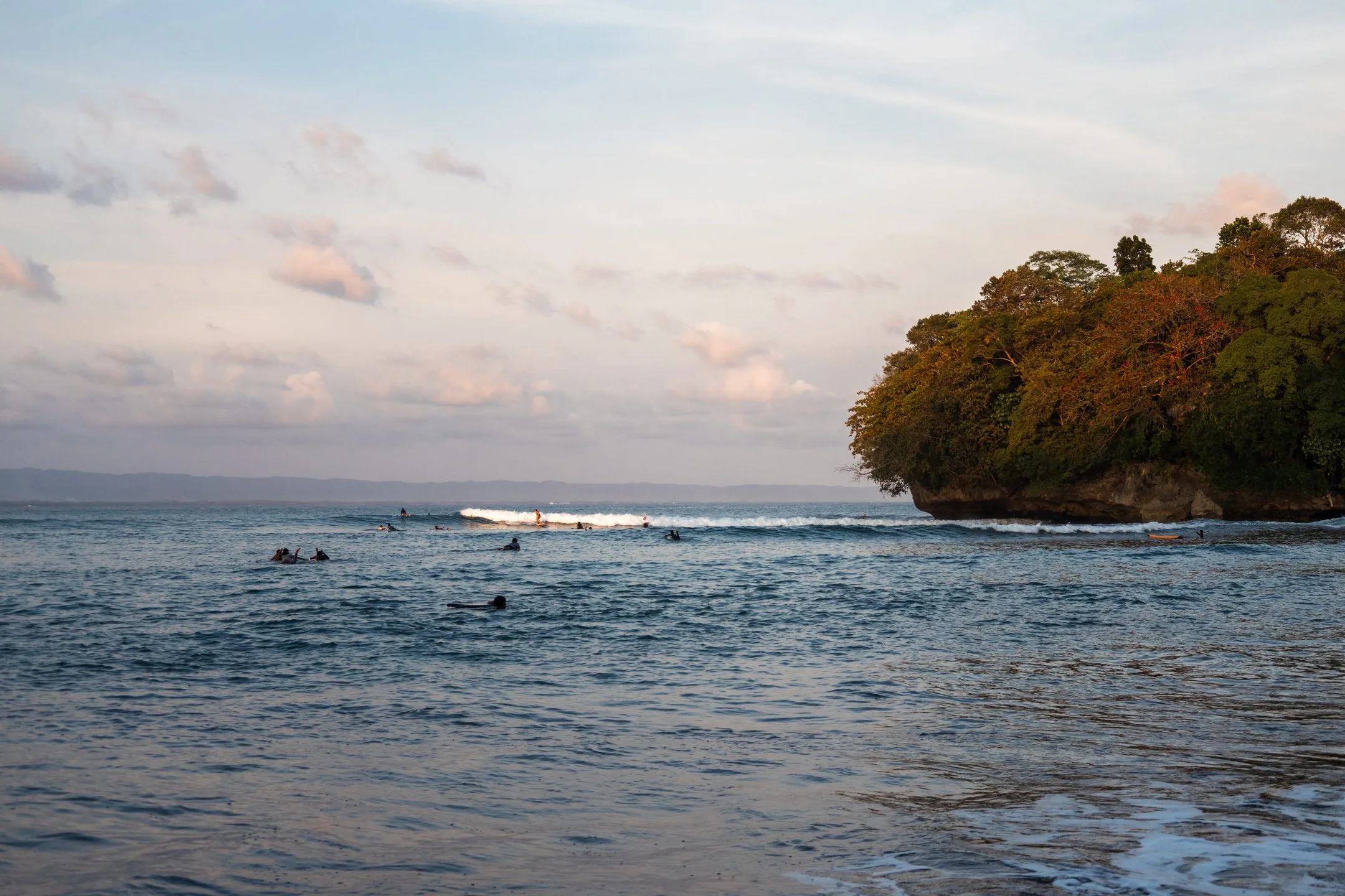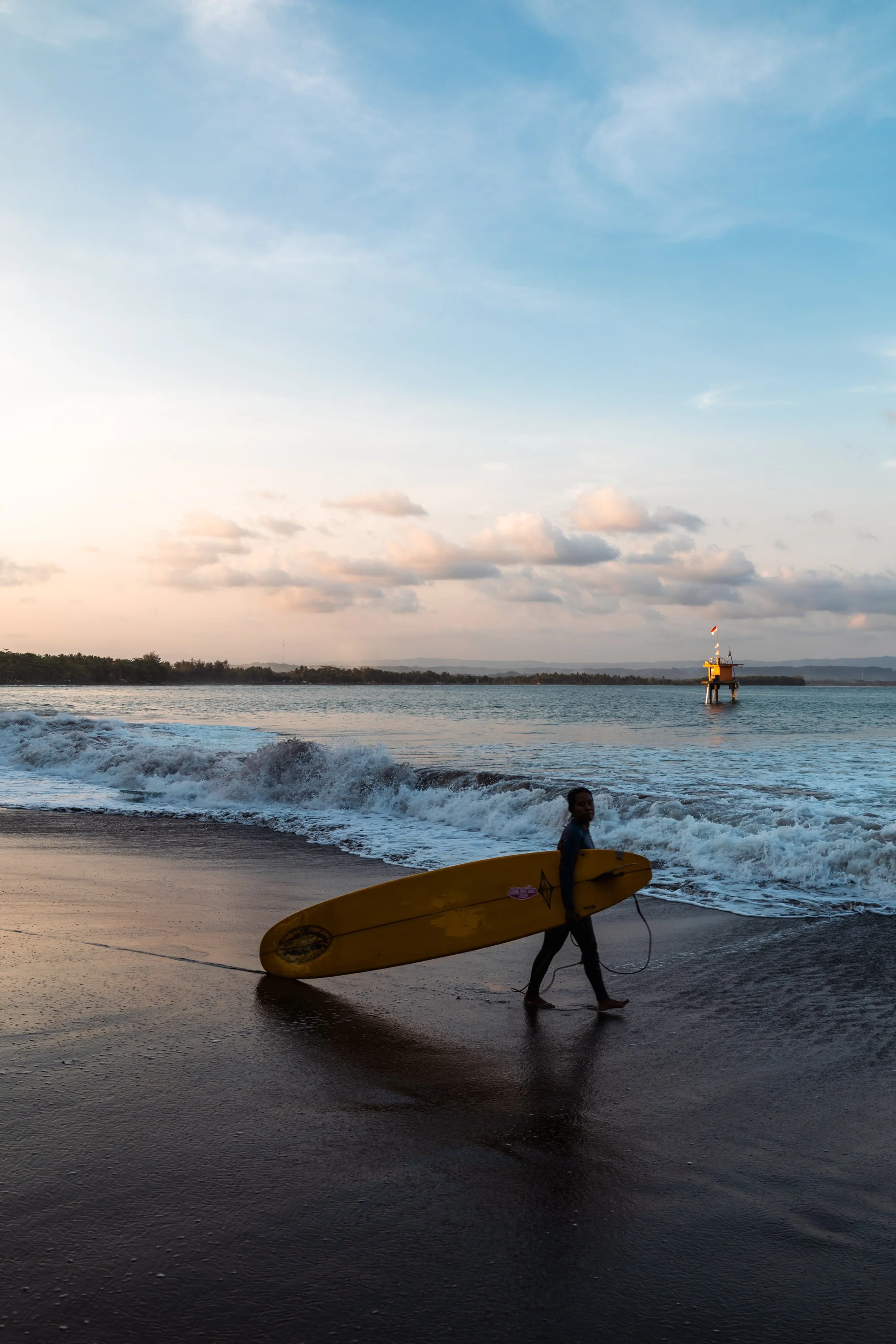 In Indonesia ci si abitua in fretta alla confusione, tra il rumore dei motorini, i suoni delle cucine per strada e le canzoni delle moschee. Ma Batukaras è un luogo dove il ritmo rallenta, diventando più silenzioso e tranquillo. Dopo aver lasciato lo zaino in una piccola guest house, mi incamminai verso il mare per ammirare il tramonto. La spiaggia, semplice e suggestiva con una distesa di sabbia vulcanica, era bagnata da un mare calmo. Il vento portava l'odore del sale e delle barche dei pescatori. L'onda, morbida e prevedibile, era perfetta per i principianti, ma abbastanza lunga da incantare anche i più esperti. La baia, chiusa da una scogliera verde, dava l'impressione di essere una giungla sull’oceano. Era sabato e la spiaggia era affollata da turisti locali in cerca di pace lontano dal caos di Jakarta.